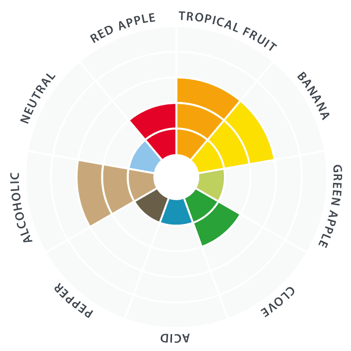 Spicy phenolics with clove and pepper, layered with fruit notes. At warmer fermentation temperatures expect tropical tones and banana. At cooler temperatures look for raisin, date, and fig alongside a subtle warming alcohol character.